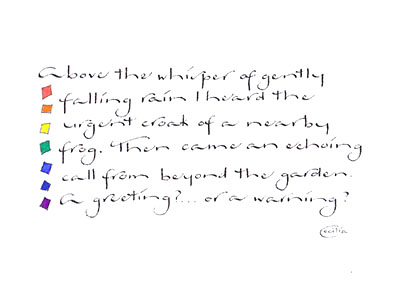 Above the whisper of gently falling rain I heard the urgent croak of a nearby frog. Then came an echoing call from beyond the garden. A greeting?...... or a warning? |
